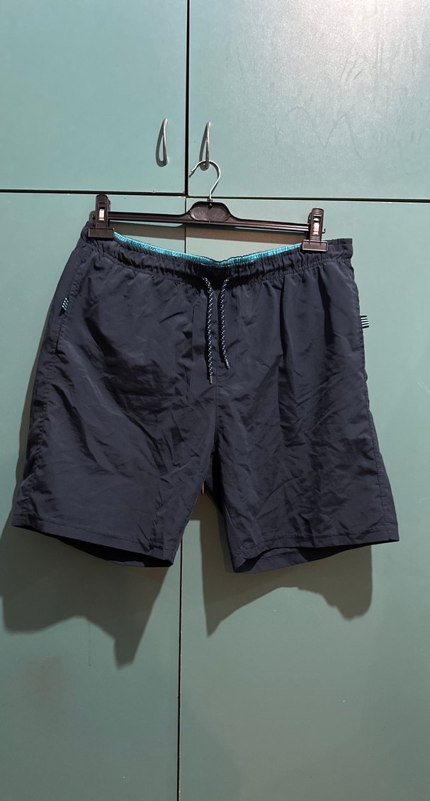 Erkekler için bol kesim, kemerli ve düz mavi renkte kısa yüzme şortu. Sokak stili ve athleisure havası taşır, dış mekan kullanıma uygundur.