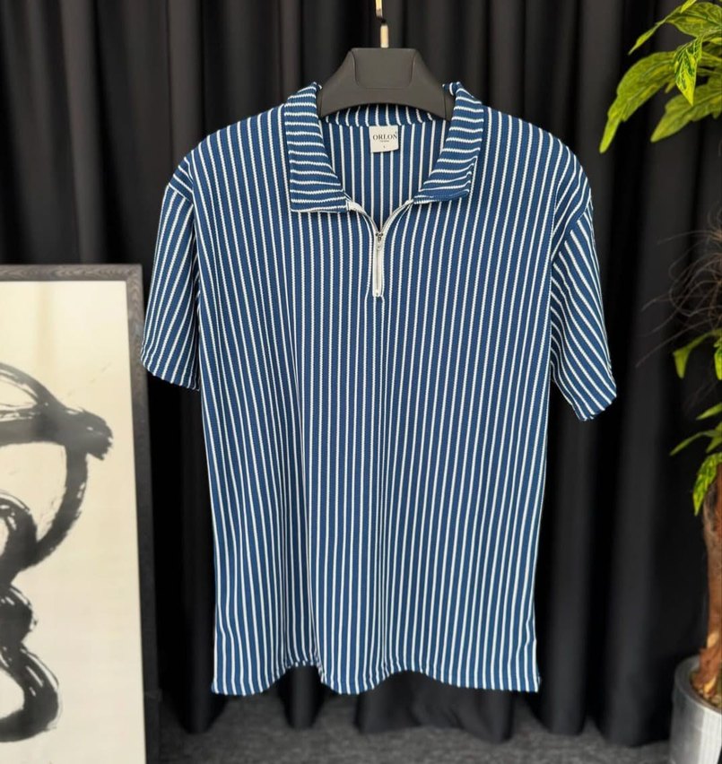 Erkek polo tişört, yakalı, kısa kollu ve fermuarlı detaylıdır. Sentetik kumaştan, koyu mavi-beyaz çizgili ve rahat kesimdir.