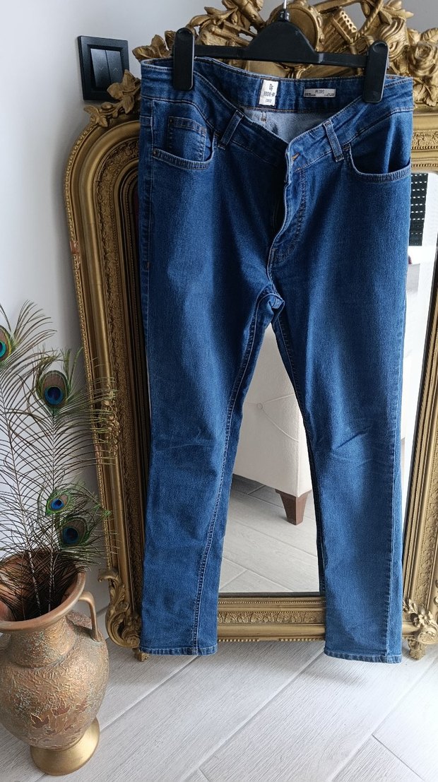 Erkekler için dar kesim, parlak mavi denim kot pantolon, rahat ve gündelik sokak stili sunar.