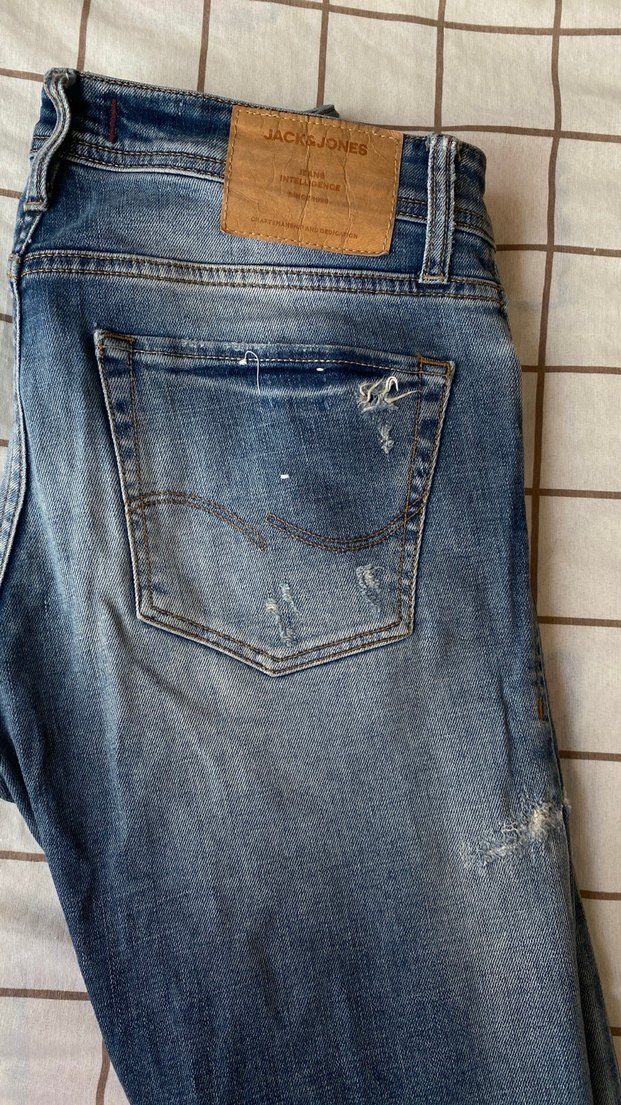 Parlak mavi renkte, bol kesim ve normal boyda erkek denim kot pantolon. Hafif yıpranmış detaylara ve kemerli stile sahiptir.