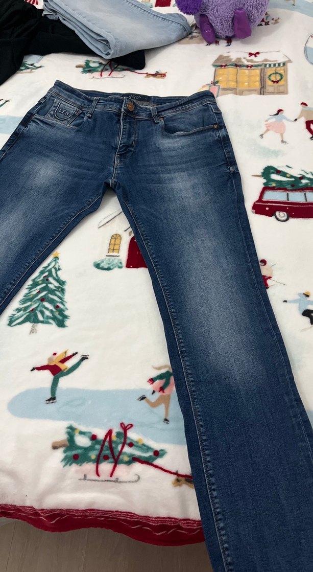 Erkekler için mavi denimden yapılmış, regular fit kesim ve düğmeli kapanışa sahip kot pantolon. Günlük rahat sokak stili için uygundur.