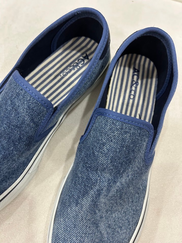 Mavi renkli, bağcıksız cırt cırtlı, batik desenli erkek denim espadril ayakkabı. Rahat günlük ve sokak stiline uygun. 44 numara
