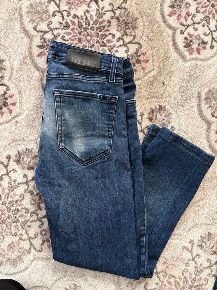 Erkekler için geniş kesim, normal boyda kot pantolon. Dayanıklı denimden yapılmış, tokalı detaylı ve gri tonlu mavi renkte, günlük kullanıma uygun.bel 40 boy 89
