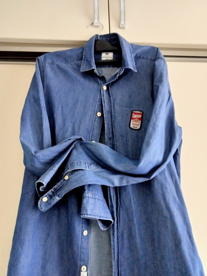 Mavi denim erkek gömlek, düğmeli ve yakası kesik. Uzun kollu, regular fit ve parlak görünümlü. Göğüs kısmında küçük bir patch detayı bulunur.
