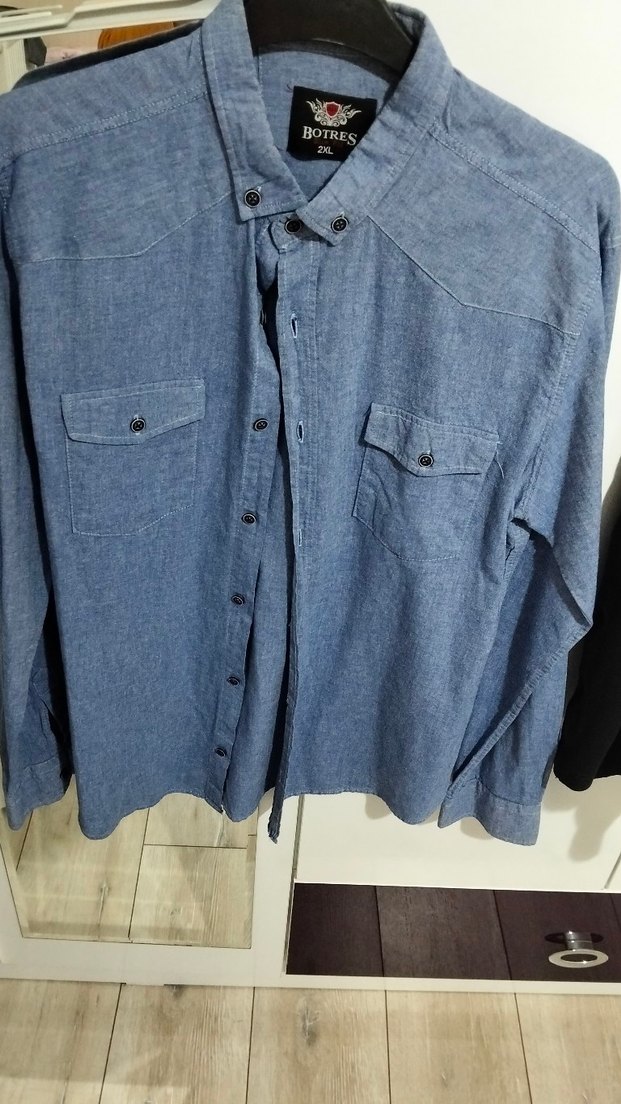 Erkekler için uzun kollu, düğmeli ve yakalı denim gömlek. Rahat kesimi ve mavi-gri tonu ile günlük kullanım için uygundur.