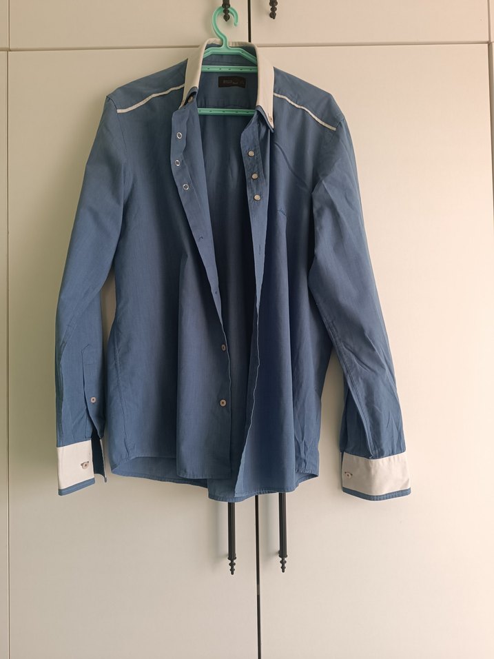 Erkek mavi denim gömlek, düğmeli uzun kollu ve normal boyda. Ofis için uygun, minimal sokak stili dokunuşlu sade tasarıma sahip.