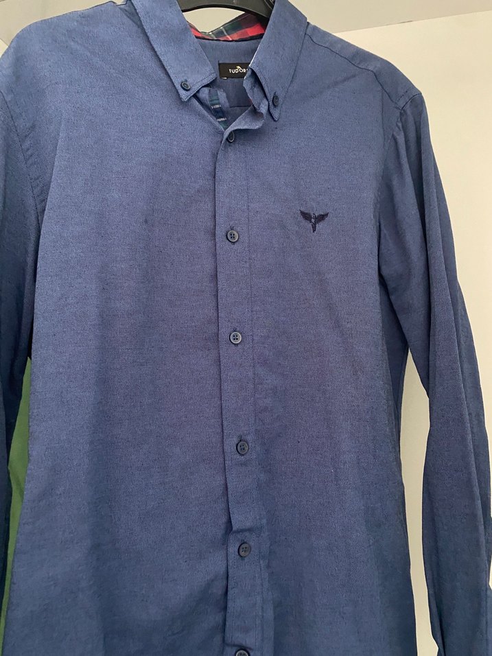 Uzun kollu, düğmeli yaka ve mavi gri tonlarında denim kumaştan yapılmış erkek gömleği. Rahat kesimli, küçük nakışlı, günlük ve ofis kullanımı için uygundur.
