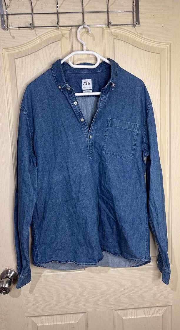 Bu erkek denim gömlek, bol kesim, uzun kollu ve yakalıdır. Düğmeli ve göğüs cebine sahiptir. Günlük rahat kullanıma uygundur.