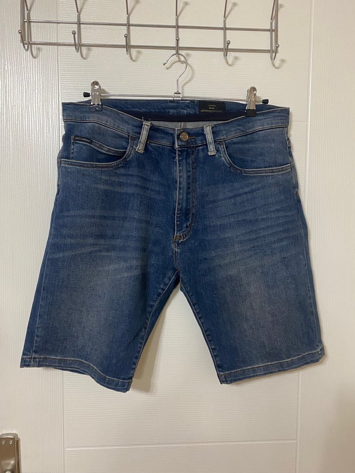 Erkekler için mavi-gri tonlarında, kemerli ve regular fit kesime sahip denim şort. Günlük kullanıma uygun, rahat ve sokak stiline uygun.