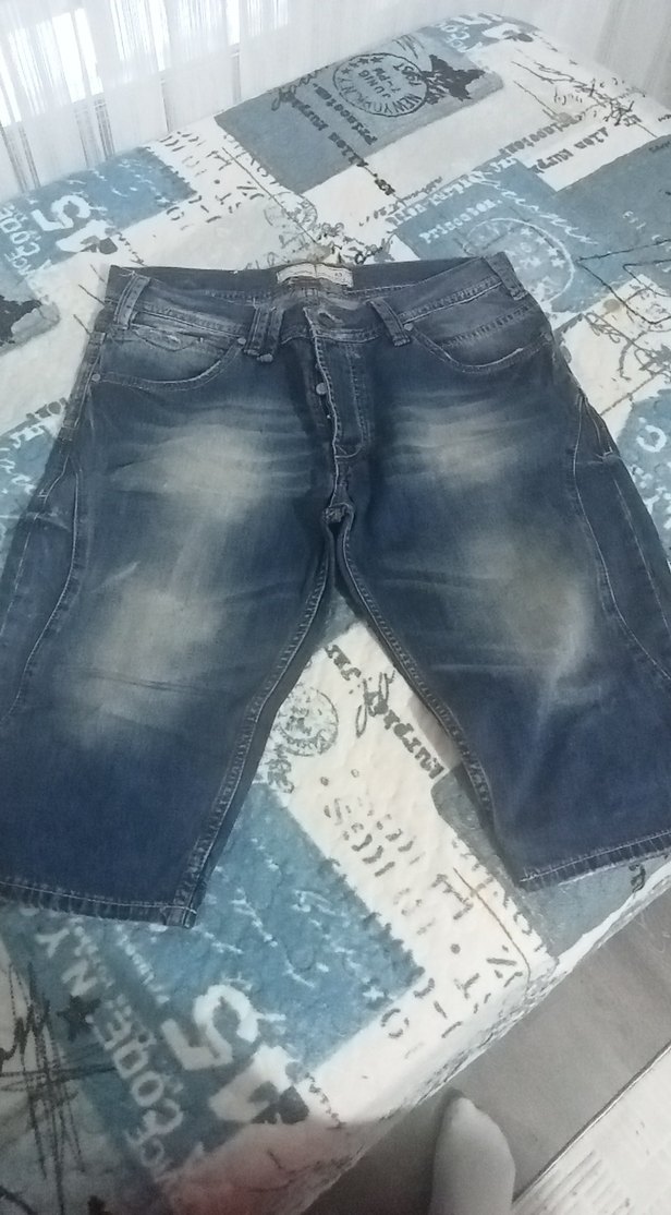 Erkekler için kısa ve bol kesim, mavi-gri tonlarında denim jean. Kemer tokası detayı ve günlük sokak stili için uygundur.