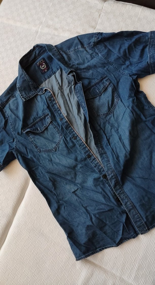 Erkekler için bol kesim, kısa kollu ve kesik yaka denim gömlek. Düğmeli ön ve iki göğüs cebine sahip. Mavi kot gömlek günlük ve sokak stiline uygundur.