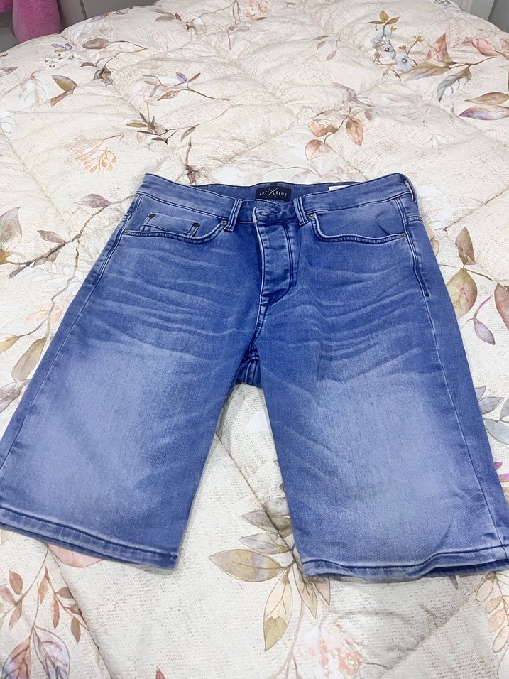 Erkekler için düğmeli, bol kesim mavi denim şort.