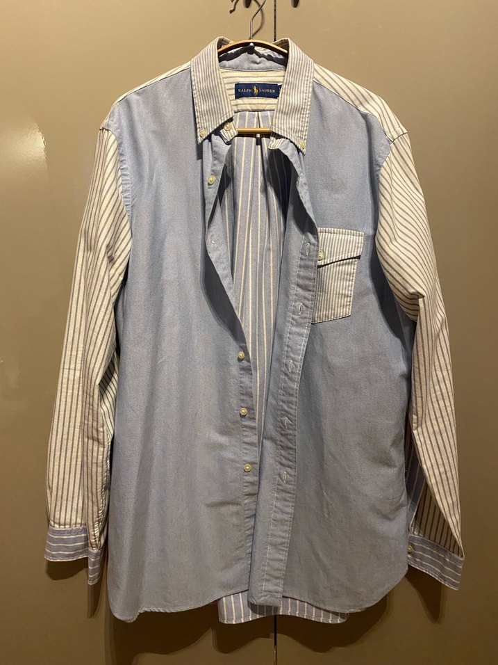 Erkek gömlek, mavi denim ve çizgili kumaş karışımı, yakalı, uzun kollu. Orijinal Ralph Lauren marka, kullanımdan dolayı hafif sararmalar var.