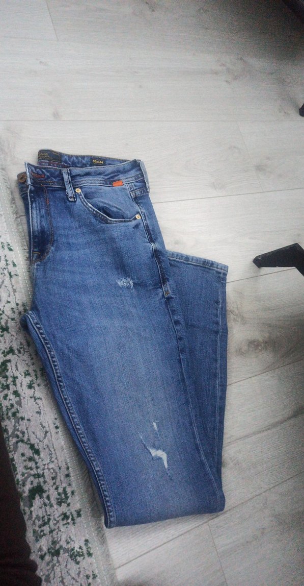 Mavi denim erkek kot pantolon, regular fit ve normal boyda, tokalı detaylı. Günlük kullanıma uygun rahat stil. çok iyi durumda