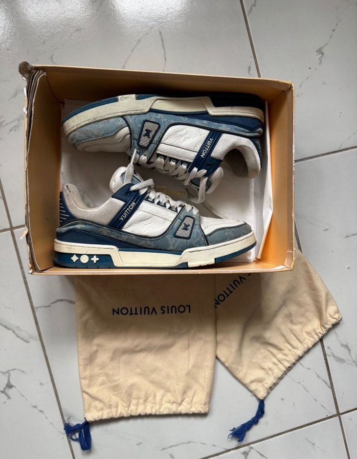 Mavi ve gri denim malzemeden üretilmiş, baskılı detaylara sahip erkek spor ayakkabısı Velcro bantlıdır.