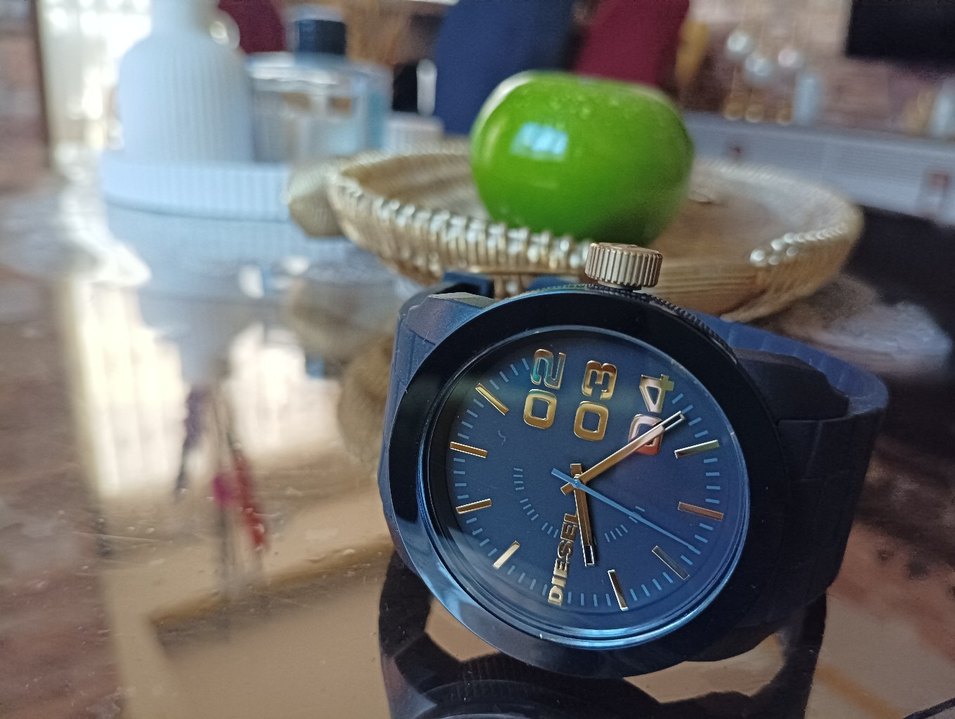 Bu erkek kol saati, büyük renkli rakamlar ve sağlam kasa ile mavi kadrana sahip, sokak stilini yansıtıyor. ⌚
