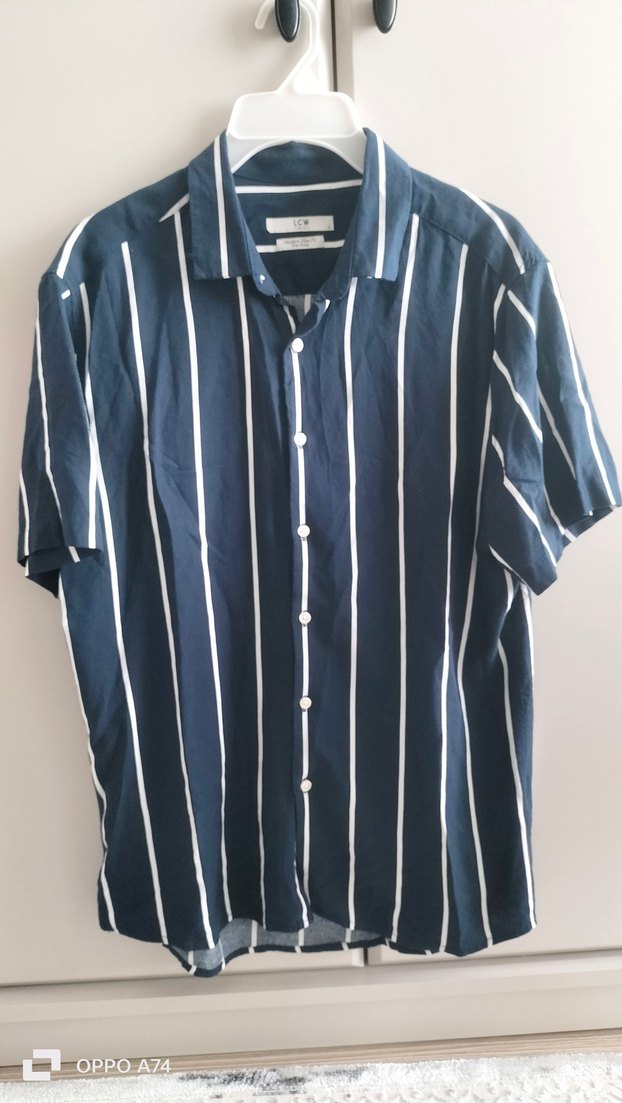Erkek gömlek, kısa kollu ve düğmeli ön detaylıdır. Regular fit ve koyu mavi zemin üzerine beyaz dikey çizgiler bulunur. l beden viskon kumaş sorunsuz