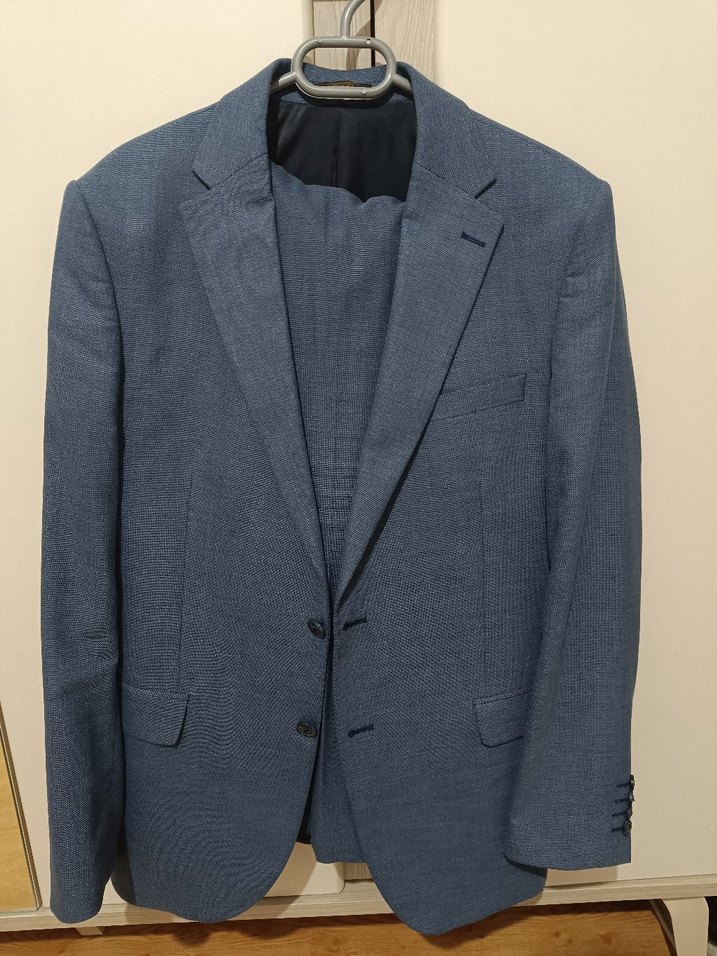 Erkekler için düğmeli, klasik kesim, mavi renkte, uzun kollu, ofis için uygun modern klasik tarzda ceket.