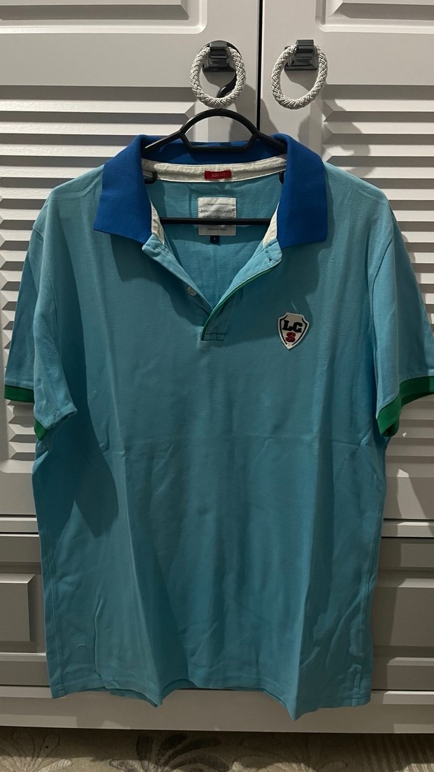 Pamuk kumaştan yapılmış, düğmeli yakalı, kısa kollu, pastel mavi renkli ve baskılı detaylara sahip erkeklere özel dar kesim polo tişört. L beden