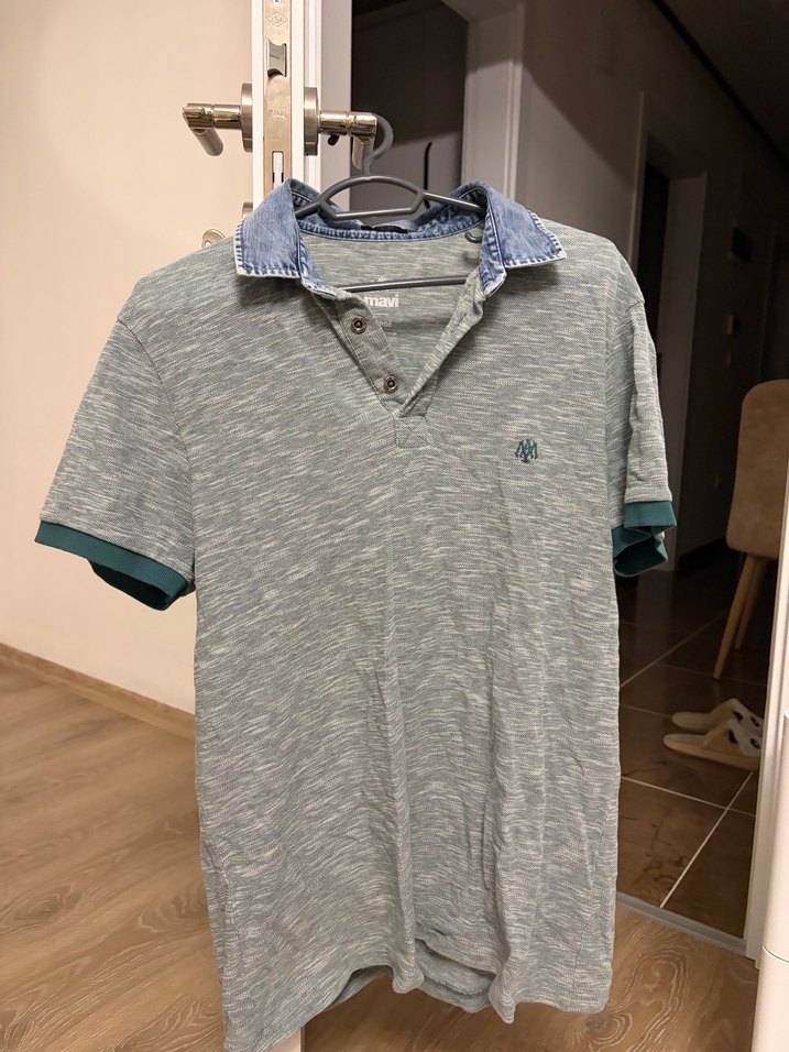 Erkek gri polo tişört, denim yakalı ve düğmeli plaketlidir. Kısa kollu ve bol kesimdir, rahat sokak stili için uygundur.