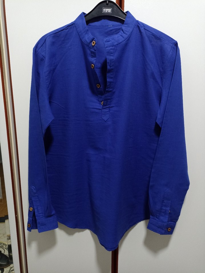 Erkek keten kumaştan, düğmeli ve yakalı, uzun kollu rahat kesim mavi gömlek. Günlük sokak stili için uygundur.