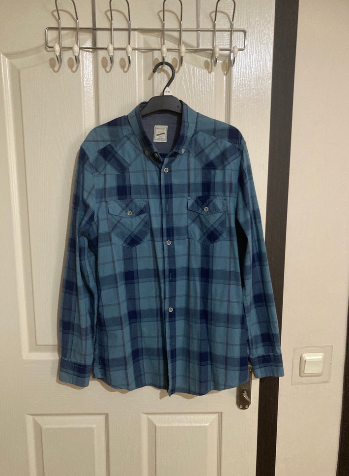 Uzun kollu, yakalı ve düğmeli erkek mavi ekose desenli denim gömlek. En 54 cm Boy 76 cm Kol boyu 64 cm