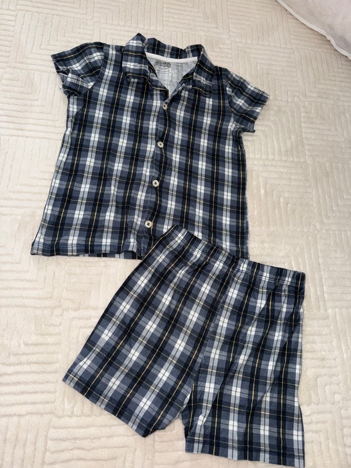 Erkekler için koyu mavi ekose desenli, kısa kollu, düğmeli ve bol kesim pijama takımı. Kısa paça şort ve yakası kesik detaylıdır. 3 yaş