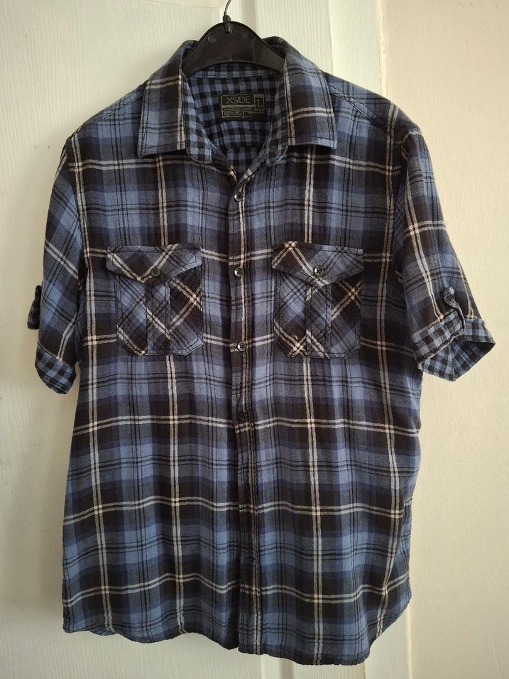 Mavi ekose desenli, düğmeli kısa kollu erkek gömleği. Yumuşak denim kumaştan, bol kesim ve sokak stili için uygun.