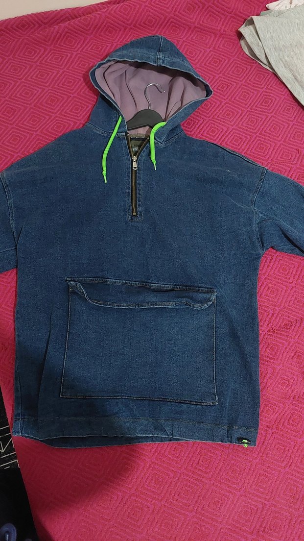 Bu erkek mavi denim ceket, bol kesim, yuvarlak yaka, uzun kollu ve ön fermuarlı. Neon yeşil ipli kapüşon ve büyük ön cep içerir, rahat günlük kullanım için uygun.