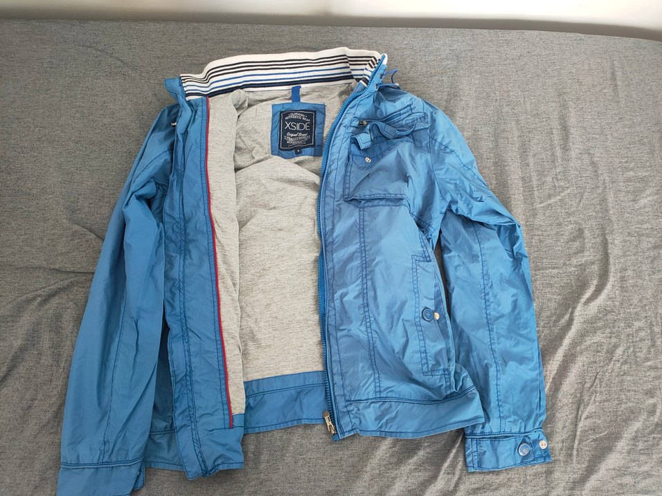 Erkekler için fermuarlı, mavi dış yüzeyli ve yumuşak gri polar astarlı ince yağmurluk. mevsimlik