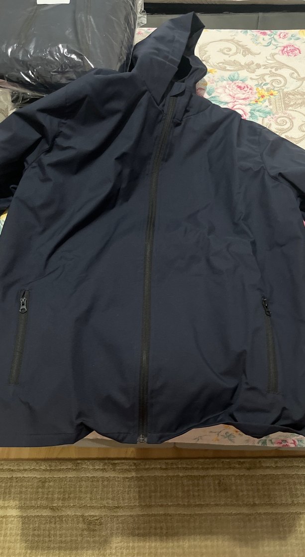 Erkekler için fermuarlı, yüksek yakalı ve uzun kollu ince yağmurluk. Sentetik kumaştan, koyu mavi renkte, günlük kullanıma uygun.