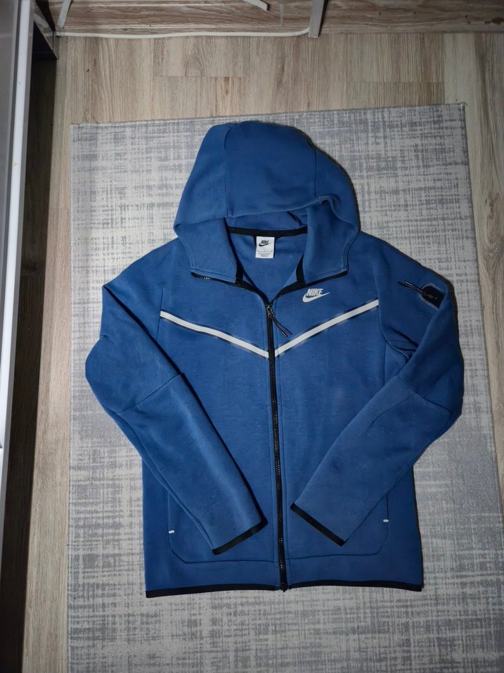 Erkekler için mavi renkli, fermuarlı ve kapüşonlu sweatshirt. Dar kesim, uzun kollu ve desen içermeyen tasarımıyla günlük kullanıma uygundur.