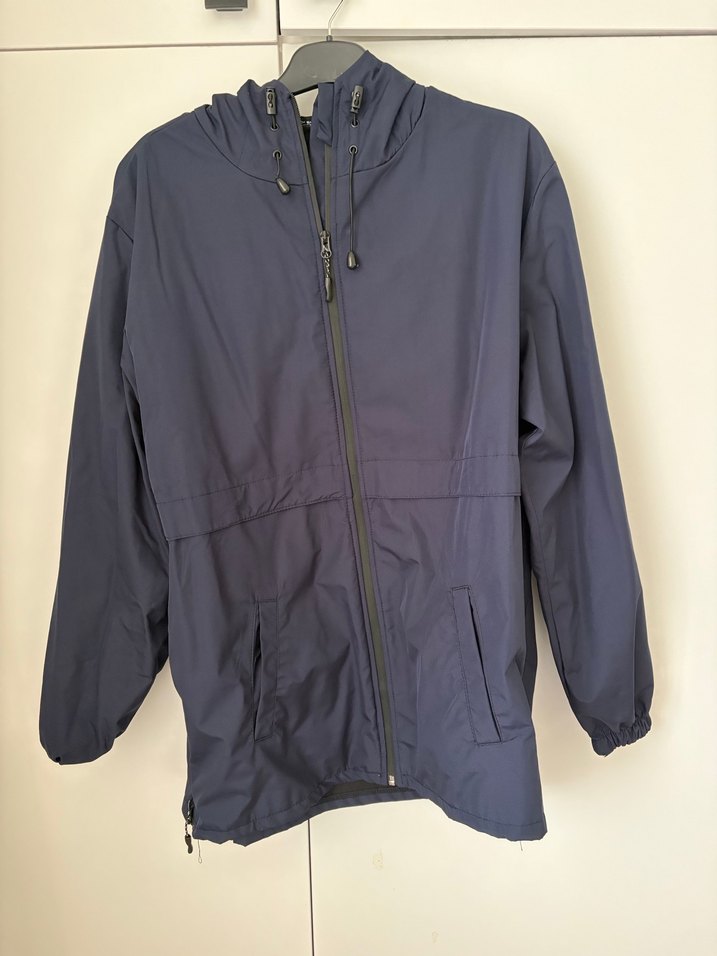 Erkek mavi yağmurluk, fermuarlı ve kapüşonlu, notched lapel yaka ve uzun kolludur. Rahat kesimi ve yumuşak iç yüzeyiyle dış mekan kullanımı için uygundur. Xxl