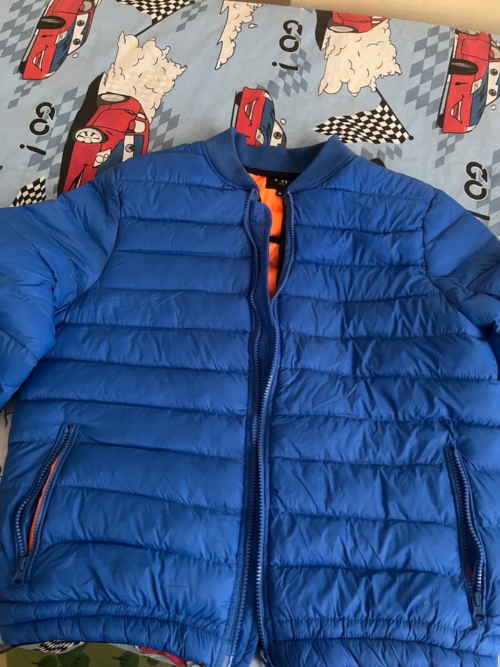 Herhangi bi sökük yırtık yok gayet iyi durumda iç kenarda dikiş hatası bar çok küçük onun dışında bi sorunu yok fermuarlı cepli, yakalı ve fitted kesim mavi mont. Yumuşak ve sıcak kumaştan, sokak stiline uygun. Üzerinde "yazısı bulunur.