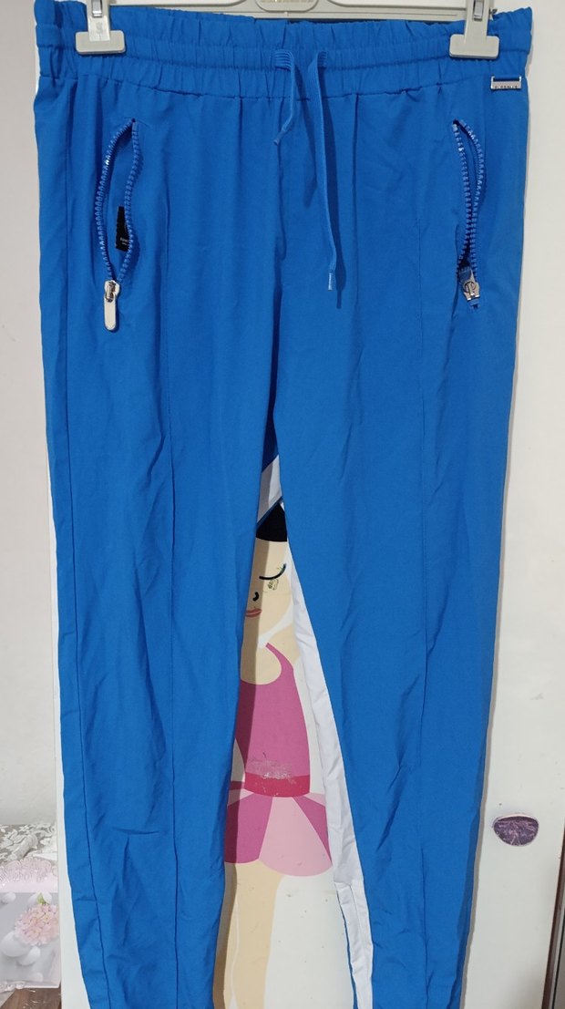 Sentetik kumaştan, fermuarlı cepleri olan mavi, bol kesim uzun eşofman. Spor ve rahat sokak stili için uygundur. ♀️