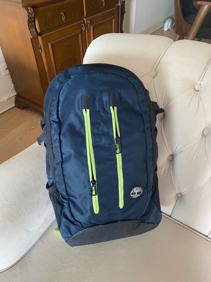 Koyu mavi renkli, iki fermuarlı bölmeli, baskılı logolu erkek sırt çantası. Trendy casual sokak stiline uygun, athleisure tarzda. Cok temız az kullanılmıs fazlalıktan