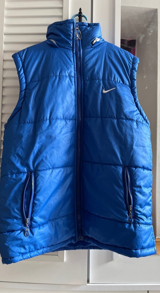 Erkekler için parlak mavi renkli, fermuarlı cepli, yakalı, normal boy şişme yelek. Rahat ve şık sokak stili için uygun. Nike logosu göğüste yer alır.