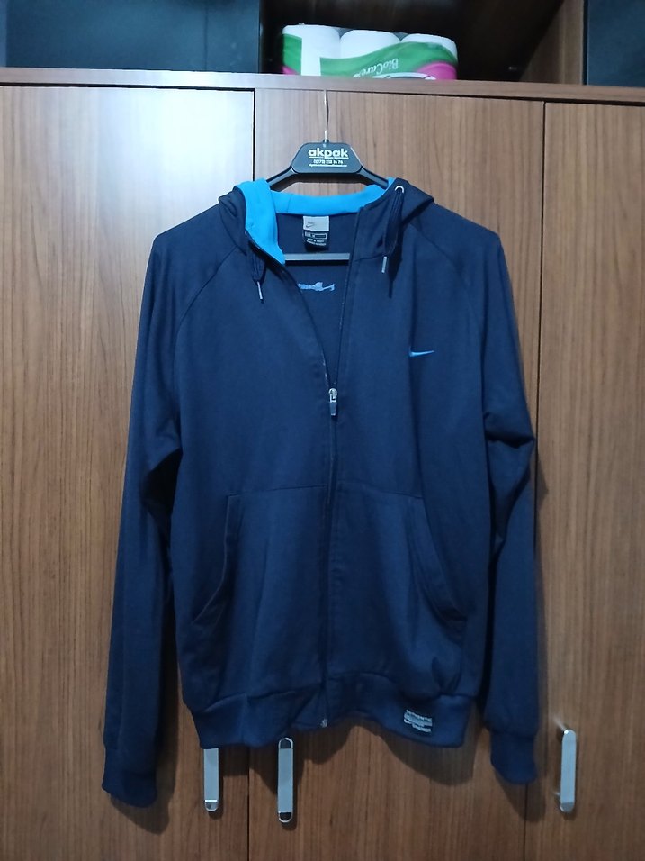 Erkekler için dar kesim, fermuarlı ve yüksek yakalı uzun kollu sweatshirt. Yumuşak kumaştan, koyu mavi renkte, günlük kullanıma uygun.