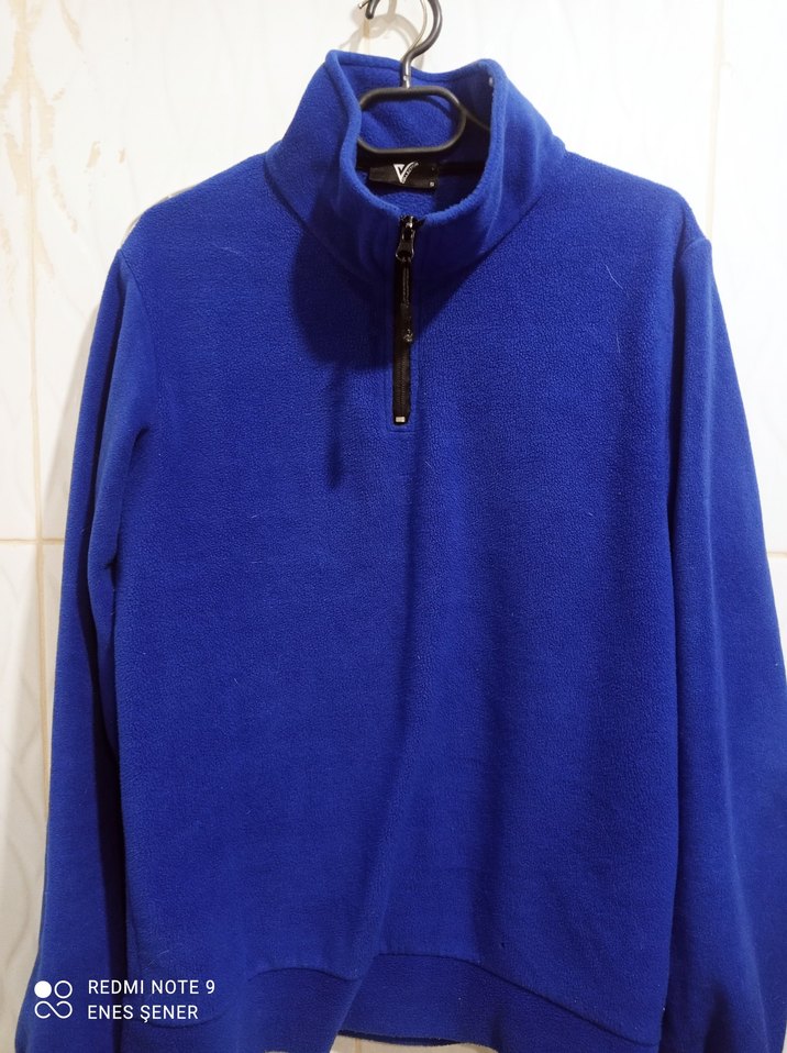 Erkekler için parlak mavi renkte, yüksek yakalı ve fermuarlı sweatshirt. Uzun kollu, bol kesim, yumuşak ve sıcak kumaştan günlük kullanım için uygundur.