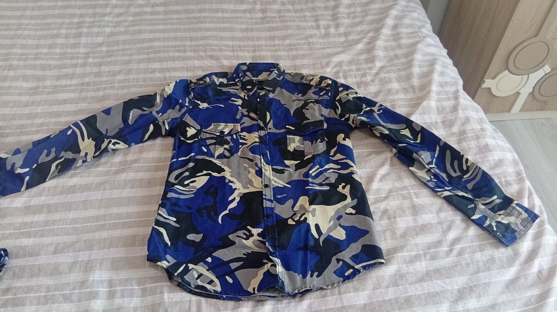 Erkek için koyu mavi kamuflaj desenli, yakalı ve uzun kollu gömlek. Düğmeli, bol kesim ve sokak modasına uygun tarzda. yeni hiç kullanılmadı