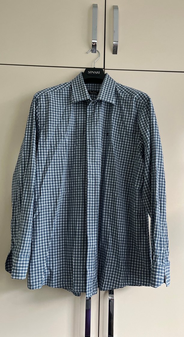 Erkekler için uzun kollu, yakalı ve düğmeli mavi gri kareli pamuklu gömlek. Ofis ve sokak stiline uygun, rahat kesim.
