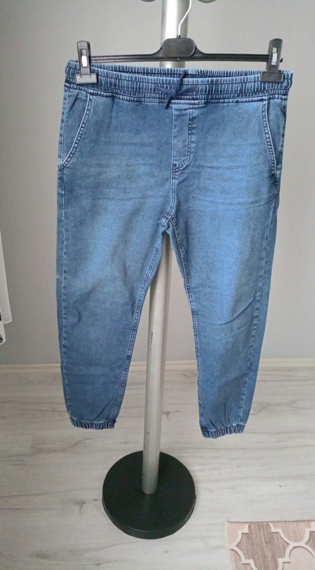 erkek için kemerli, bol kesim ve normal midi boyda kot pantolon. Mavi-gri tonlarında denim kumaştan üretilmiştir, günlük sokak stili için uygundur.