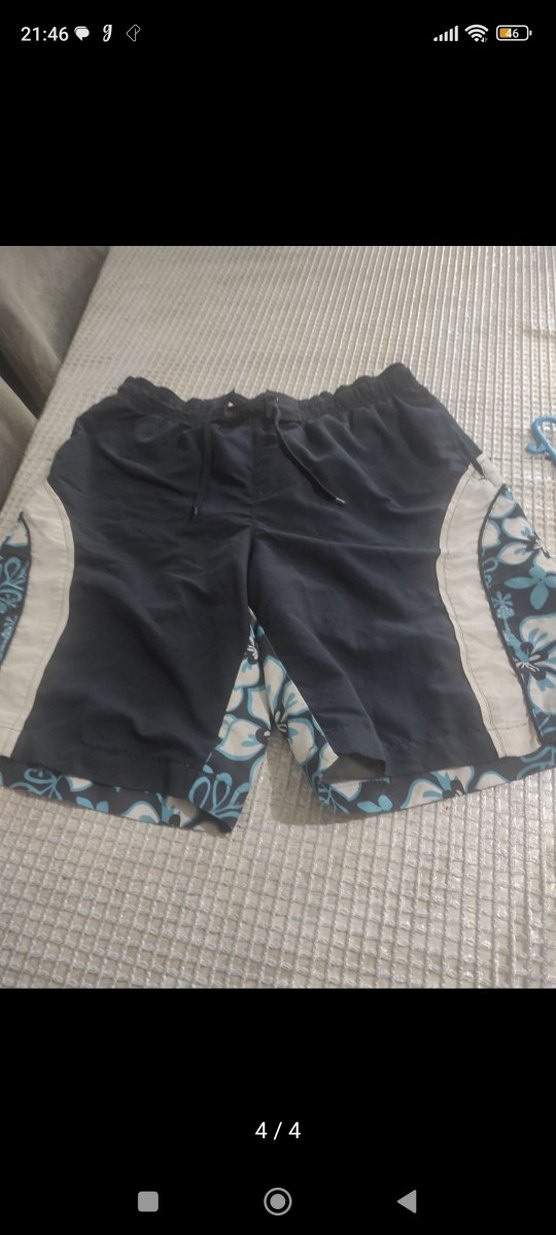 Yanları çiçek desenli mavi ve gri erkek yüzme şortu. Ayarlanabilir bağcıklı lastikli beli vardır. mbeden
