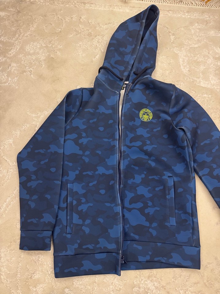 Erkek için koyu mavi kamuflaj desenli, kapüşonlu ve fermuarlı uzun kollu sweatshirt. Rahat ve sıcak kumaştan üretilmiştir. Alt üst takım