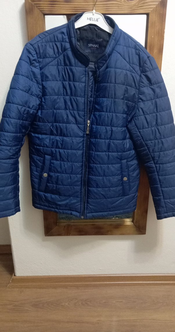 Erkekler için parlak mavi kapitone sentetik kumaştan yapılmış, fermuarlı ve normal boyda uzun kollu mont. Günlük kullanıma uygundur.