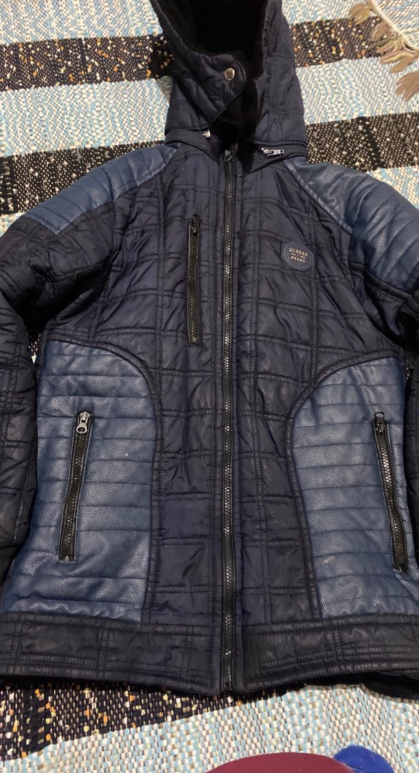 Erkekler için mavi kapitone fermuarlı, uzun kollu, normal boy midi mont. Sentetik kumaştan üretilmiş, sokak stiline uygun ve dar kesim.