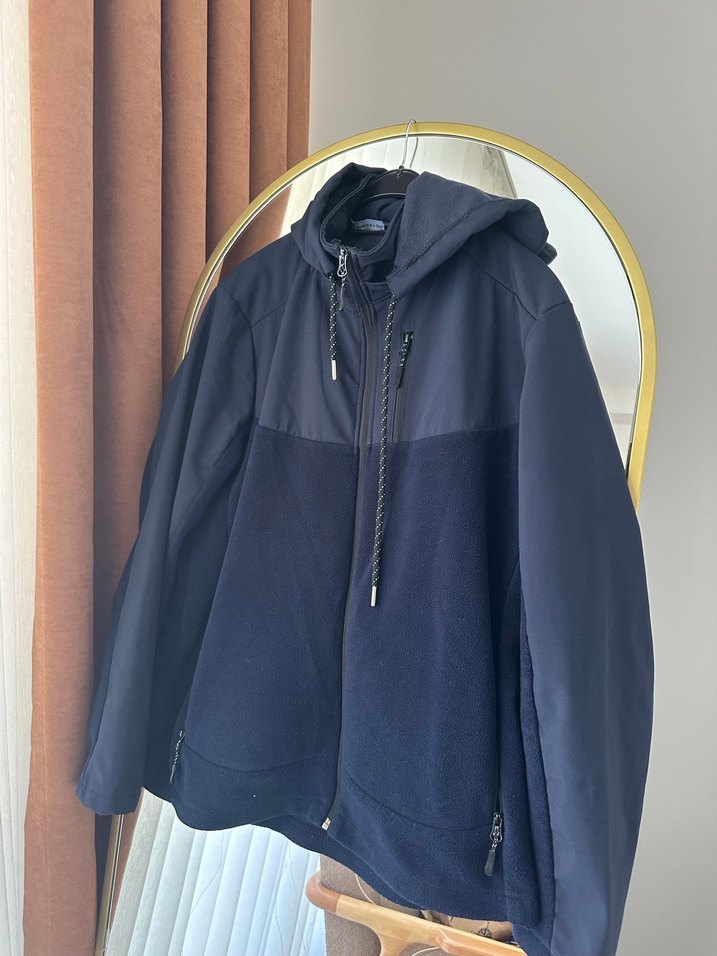 Erkek mavi kapüşonlu fermuarlı rüzgarlık, yumuşak fleece kumaştan, bol kesim ve uzun kolludur. Normal midi boy ve sade tasarıma sahiptir. ️