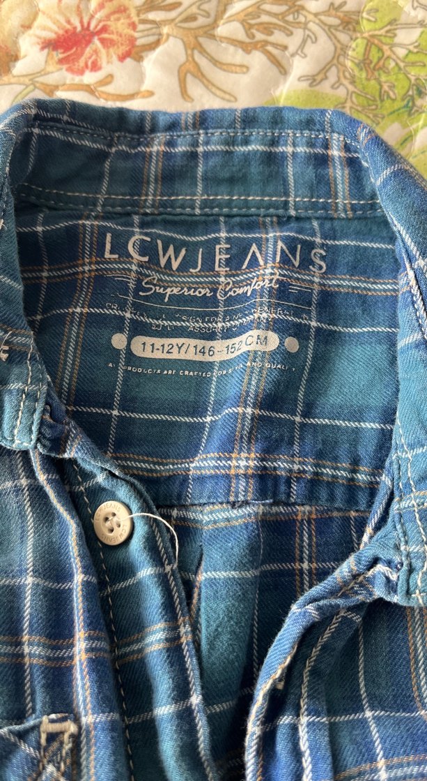 LCW Jeans markalı, düğmeli, mavi kareli uzun kollu denim gömlek. Normal boyda, bol kesim ve kesik yaka detaylı, günlük sokak stili için uygun.