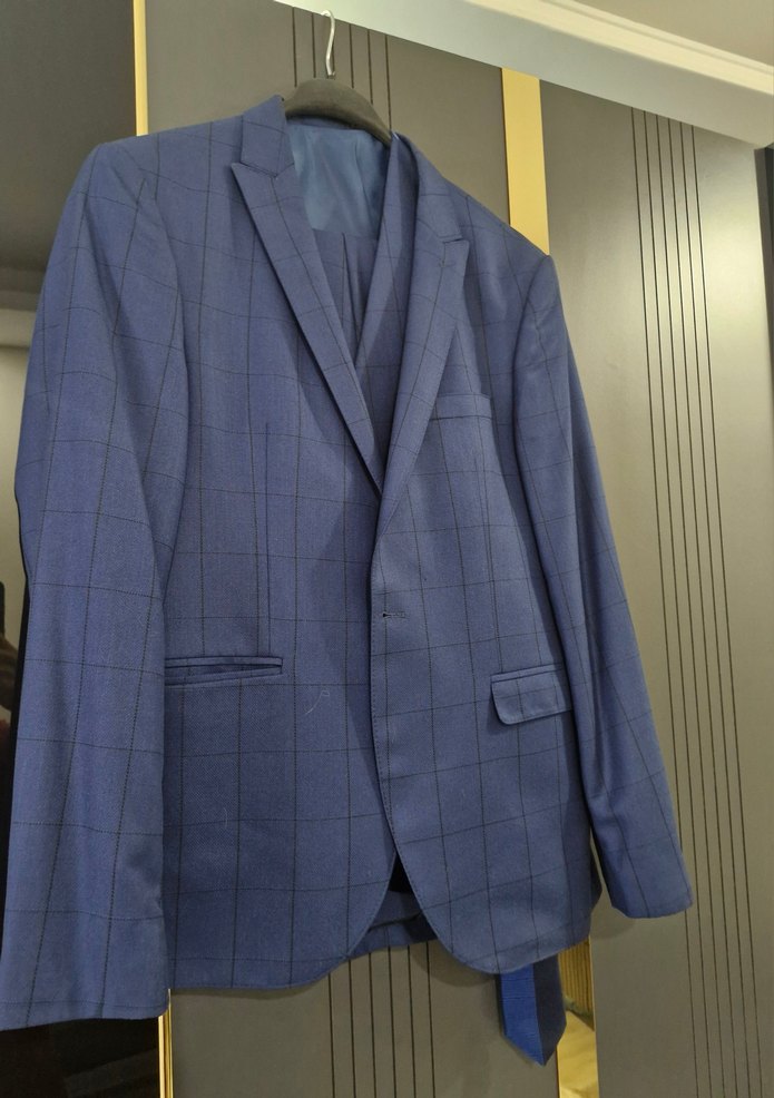marka temsiii.erkek mavi kareli takım elbise, düğmeli ve kesik yaka detaylıdır. Uzun kollu, normal kesim olup ofis için uygundur. Modern klasik tarzda şık bir seçimdir. ️sıfırı 6000 tl. Bir kez düğün icin giyildi. rengi resimdekinin daha koyu. icerigi ceket yelek pantolon ve kravat fiyatıdır.