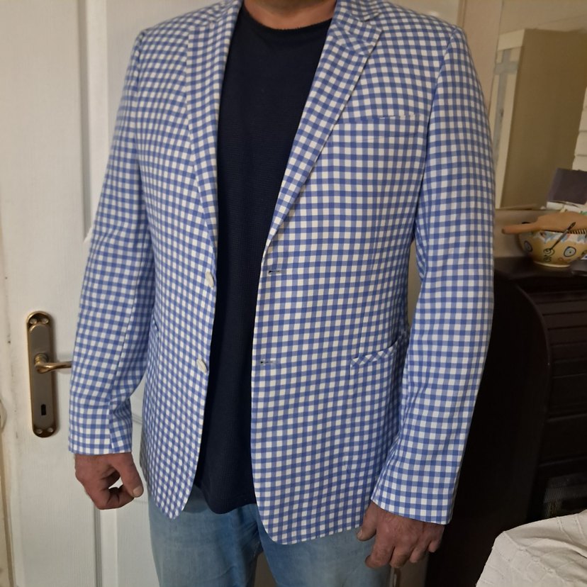 Erkekler için mavi kareli, düğmeli ve notch yakalı ceket. Normal kesim ve uzun kolludur, iş ve günlük stil için uygundur.